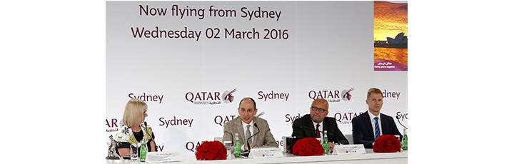 | Qatar Airways Group Chief Executive, His Excellency Mr. Akbar Al Baker (centre left), addressed a packed Sydney press conference in celebration of the opening of the airline's third Australian gateway, alongside Sydney Airport Managing Director and Chief Executive Officer, Ms. Kerrie Mather (left); Qatar Airways SVP South East Asia and South West Pacific, Mr. Marwan Koleilat (centre right) and Qatar Airways Country Manager Australasia, Mr. Adam Radwanski (right). |
